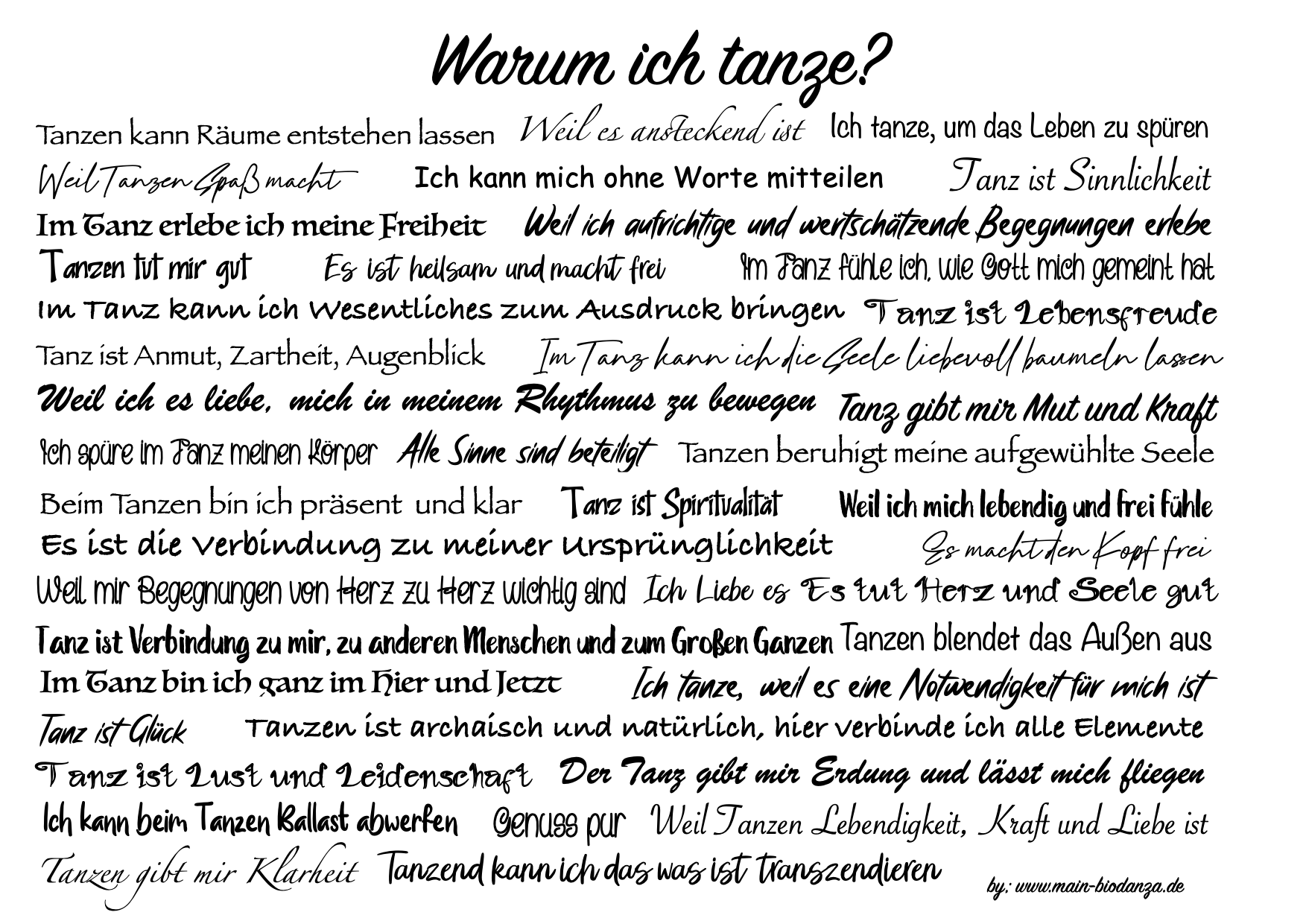 Ich tanze weil ich es liebe und es mir zutiefst Freude macht; ich tanze weil ich meine innerste Lebendigkeit dabei spüre, weil ich in Verbindung mit mir, mit den anderen Menschen und mit etwas komme, dass größer ist als wir, und weil es eines meiner stärksten Mittel ist mich auszudrücken.